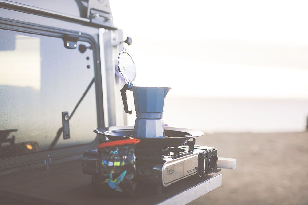 Abhilfe schafft hier ein sog. Gullwing Fenster, das es euch ermöglicht eine Seite des Fahrzeugs komplett zu öffnen. Nun haben wir sozusagen eine offene Küche und können einfach die vorbereitete Zutaten nach außen geben um direkt auf unserem selbstgebauten Tisch am Defender zu kochen. Das hat den Vorteil, dass wir im Auto eine Arbeitsplatte haben.